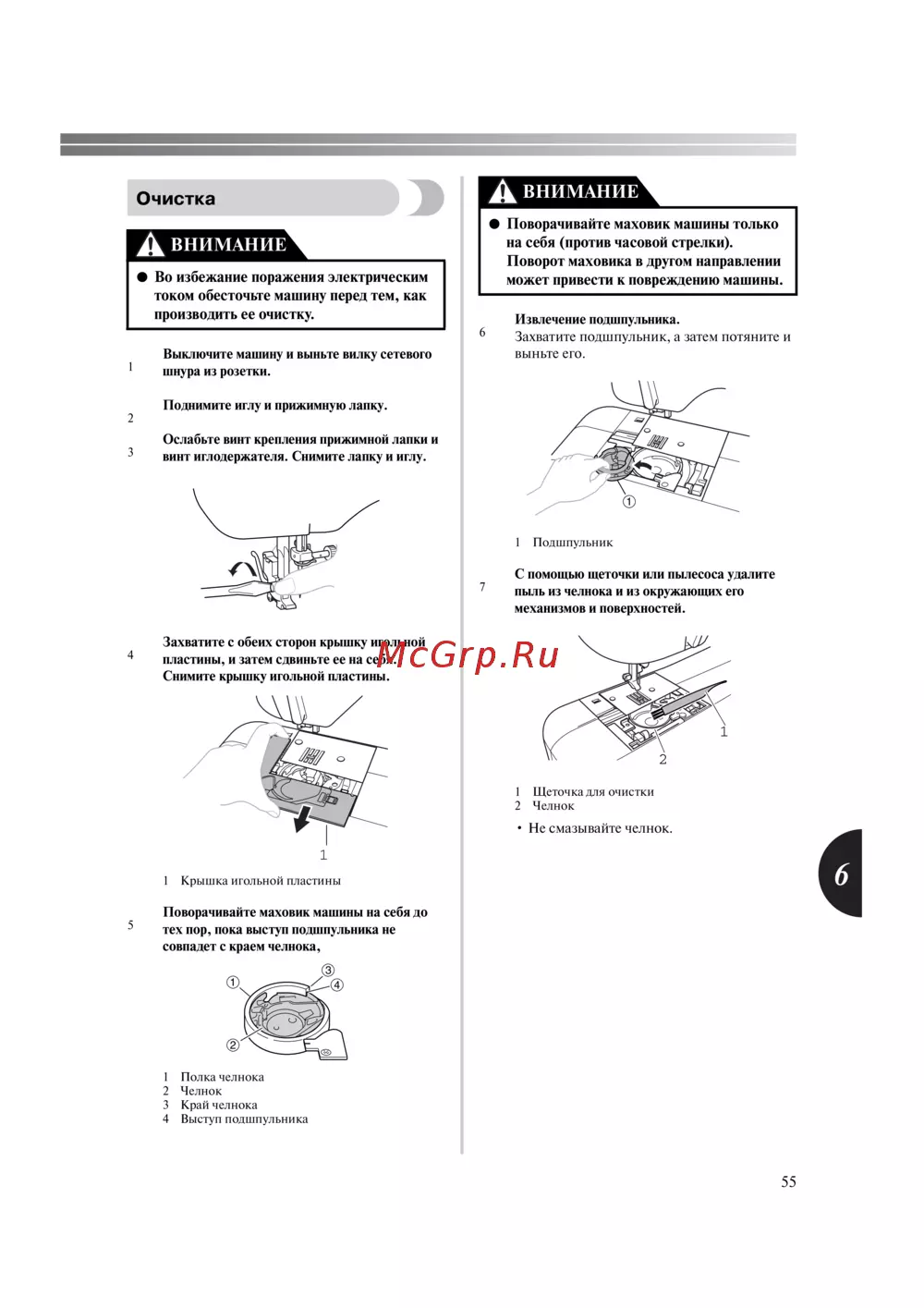 - Поворачивайте маховик машины только на себя против часовой стрелки поворот маховика в другом направлении может привести к повреждению машины p.56
