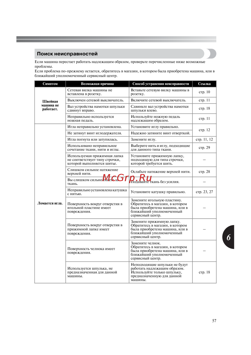 Игла погнута или затупилась. Замените иглу. стр. 11, 12
