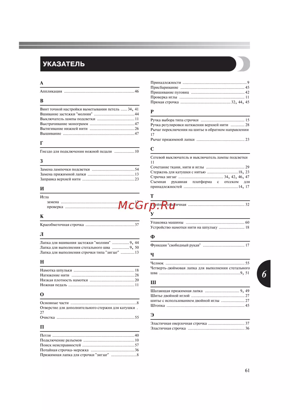 - Перед началом шитья поверните маховик машины на себя и убедитесь в том что игла не ударяет по лапке p.51