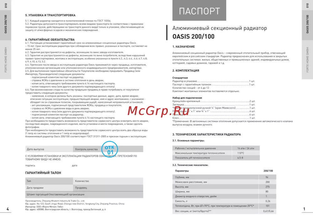 6.1. Поставщик устанавливает гарантийный срок на алюминиевые секционные радиаторы Oasis