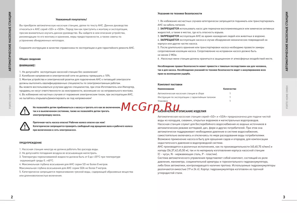 Изучите руководство по эксплуатации автоматической насосной станции. Узнайте о монтаже, мерах предосторожности и устранении неполадок для серий SD и SDA.