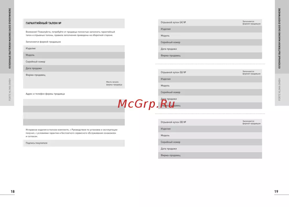 FORTE KLIMA GMBH КУХОННЫЕ ВЫТЯЖКИ MAKING OASIS EVERYWHERE FORTE KLIMA GMBH КУХОННЫЕ ВЫТЯЖКИ MAKING OASIS EVERYWHERE ГАРАНТИЙНЫЙ ТАЛОН Внимание Пожалуйста потребуйте от продавца полностью заполнить гарантийный талон и отрывные талоны правила заполнения приведены на оборотной стороне Заполняется фирмой продавцом Изделие Модель Серийный номер Дата продажи Отрывной купон Б Фирма продавец Заполняется фирмой продавцом Изделие Место печати фирмы продавца Адрес и телефон фирмы продавца Модель Серийный номер Дата продажи Фирма продавец Отрывной купон В Исправное изделие в полном комплекте с Руководством по установке и эксплуатации Заполняется фирмой продавцом Изделие получил с условиями гарантии и бесплатного сервисного обслуживания ознакомлен и согласен Модель Подпись покупателя Серийный номер Дата продажи Фирма продавец 18 19