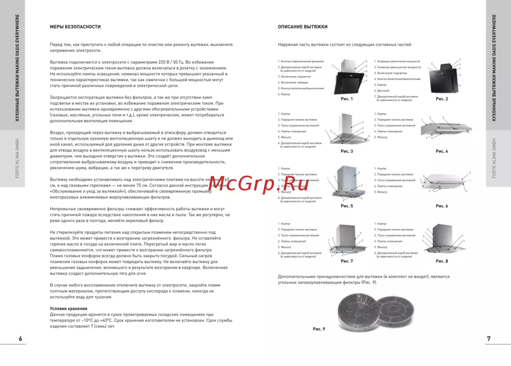 ОПИСАНИЕ ВЫТЯЖКИ Перед тем как приступить к любой операции по очистке или ремонту вытяжки выключите Наружная часть вытяжки состоит из следующих составных частей FORTE KLIMA GMBH КУХОННЫЕ ВЫТЯЖКИ MAKING OASIS EVERYWHERE FORTE KLIMA GMBH КУХОННЫЕ ВЫТЯЖКИ MAKING OASIS EVERYWHERE МЕРЫ БЕЗОПАСНОСТИ напряжение электросети Вытяжка подключается к электросети с параметрами 220 В 50 Гц Во избежание 1 Кнопки переключения режимов 1 Клавиша увеличения мощности поражения электрическим током вытяжка должна включаться в розетку с заземлением 2 Декоративный короб вытяжки в зависимости от модели 2 Клавиша уменьшения мощности Не используйте лампы освещения номинал мощности которых превышает указанный в технических характеристиках вытяжки так как лампочки с большей мощностью могут стать причиной различных повреждений в электрической цепи 3 Включение подсветки 3 Включение подсветки 4 Кнопка включения выключения 4 Включение таймера 5 Корпус 5 Кнопка включения выключения 6 Дисплей 6 Корпус Запрещается эксплуатация вытяжки без фильтров а так же при отсутствии ламп Рис 1 7 Декоративный короб вытяжки в зависимости от модели Рис 2 подсветки в местах их установки во избежание поражения электрическим током При использовании вытяжки одновременно с другими обогревательными устройствами газовые масляные угольные печи и т д кроме электрических может потребоваться 1 Корпус 1 Корпус дополнительная вентиляция помещения 2 Передняя панель вытяжки 2 Передняя панель вытяжки 3 Пульт управления вытяжкой 3 Пульт управления вытяжкой Воздух проходящий через вытяжку и выбрасываемый в атмосферу должен отводиться 4 Лампы освещения 4 Лампы освещения только в отдельную кухонную вентиляционную шахту и не должен выходить в дымоход или 5 Фильтр 5 Фильтр иной канал используемый для удаления дыма от других устройств При монтаже вытяжки 6 Декоративный короб вытяжки в зависимости от модели для отвода воздуха в вентиляционную шахту нельзя использовать воздуховод с меньшим Рис 4 диаметром чем выходное отверстие у вытяжки Это создаёт дополнительное сопротивление выбрасываемому воздуху и приводит к снижению производительности увеличению шума вибрации а так же к перегреву двигателя 1 Корпус 1 Корпус 2 Передняя панель вытяжки 2 Передняя панель вытяжки Вытяжку необходимо устанавливать над электрическими плитами на высоте не менее 65 3 Пульт управления вытяжкой 3 Пульт управления вытяжкой см а над газовыми горелками не менее 75 см Согласно данной инструкции см пункт 4 Лампы освещения 4 Лампы освещения Обслуживание и уход за вытяжкой обеспечивайте своевременную промывку 5 Фильтр 5 Фильтр многоразовых алюминиевых жироулавливающих фильтров 6 Декоративный короб вытяжки в зависимости от модели Рис 6 Непромытые своевременно фильтры снижают эффективность работы вытяжки и могут стать причиной пожара вследствие накопления в них масла и пыли Так же регулярно не реже одного раза в полгода меняйте акриловый фильтр Не стерилизуйте продукты питания над открытым пламенем непосредственно под вытяжкой Это может привести к возгоранию загрязнённого фильтра Не оставляйте 1 Корпус 1 Корпус 2 Передняя панель вытяжки 2 Передняя панель вытяжки 3 Пульт управления вытяжкой 3 Пульт управления вытяжкой 4 Лампы освещения 4 Лампы освещения горячее масло в посуде на включенной плите Перегретый жир и масло легко самовоспламеняются ч