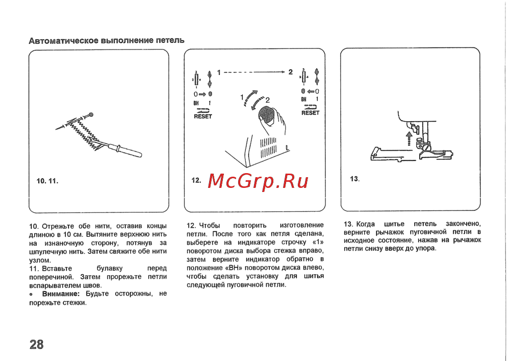 Автоматическое выполнение петель 10 Отрежьте обе нити оставив концы длиною в 10 см Вытяните верхнюю нить на изнаночную сторону потянув за шпулечную нить Затем свяжите обе нити узлом 11 Вставьте булавку перед поперечиной Затем прорежьте петли вспарывателем швов е Внимание Будьте осторожны не порежьте стежки 28 12 Чтобы повторить изготовление петли После того как петля сделана выберете на индикаторе строчку 1 поворотом диска выбора стежка вправо затем верните индикатор обратно в положение ВН поворотом диска влево чтобы сделать установку для шитья следующей пуговичной петли 13 Когда шитье петель закончено верните рычажок пуговичной петли в исходное состояние нажав на рычажок петли снизу вверх до упора