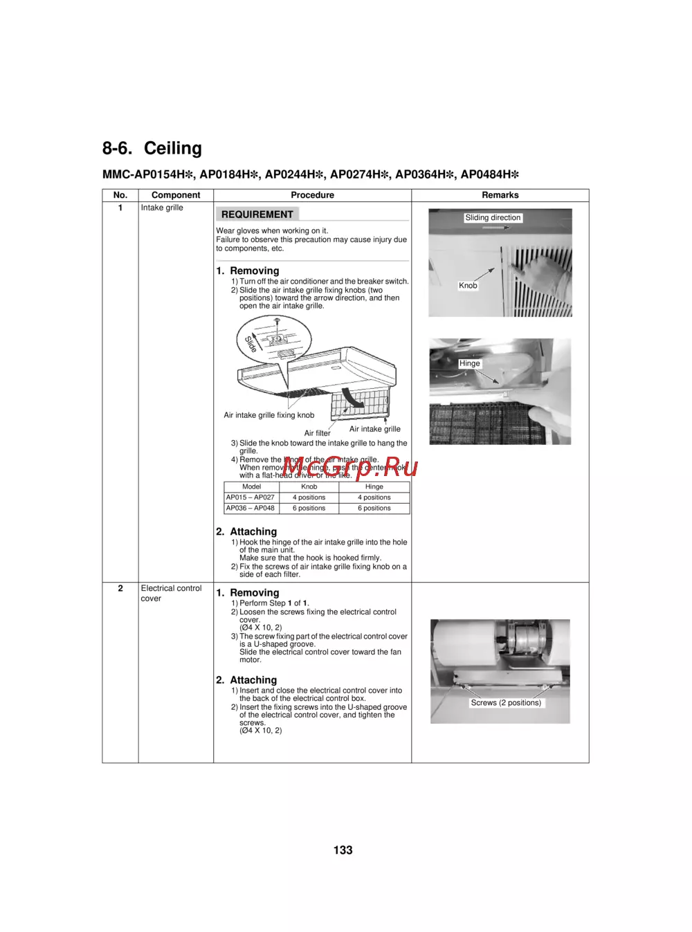 - Stop the air conditioner and turn off the main power 2 pull the upper part of the intake grille toward you remove the two strings connecting the intake grille and main unit and then pull up the intake grille to remove it 3 follow the procedure below to remove the electrical control box put on the bottom board p.142