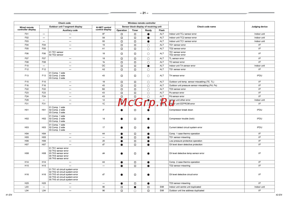 - The following list shows each check code find the check contents from the list according to part to be checked in case of check from indoor remote controller see wired remote controller display in the list in case of check from outdoor unit see outdoor unit 7 segment display in the list in case of check from ai net central control remote controller see ai net central control display in the list in case of check from indoor unit with a wireless remote controller see sensor block display of receiving unit in the list lighting flashing goes off ai net artificial intelligence ipdu intelligent power drive unit alt flashing is alternately when there are two flashing led sim simultaneous flashing when there are two flashing led p.21