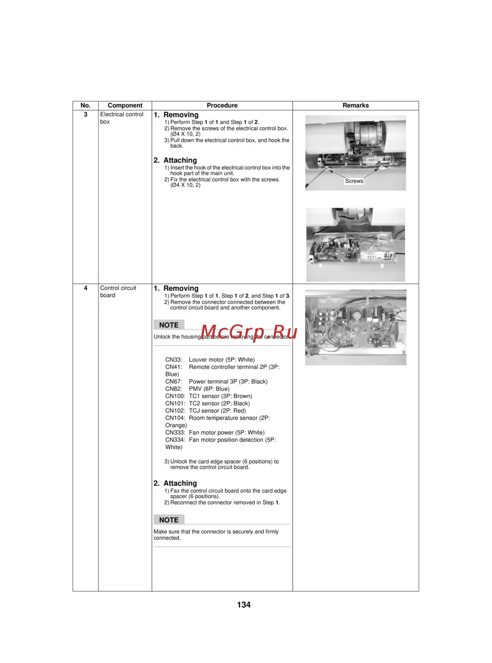 - Perform step 1 and 2 of electrical component assembly 2 remove the two screws fixing the upper cabinet slide the cabinet upward by approximately 30 mm and pull it out toward you 3 follow the procedure below to remove the heat exchanger assembly p.143