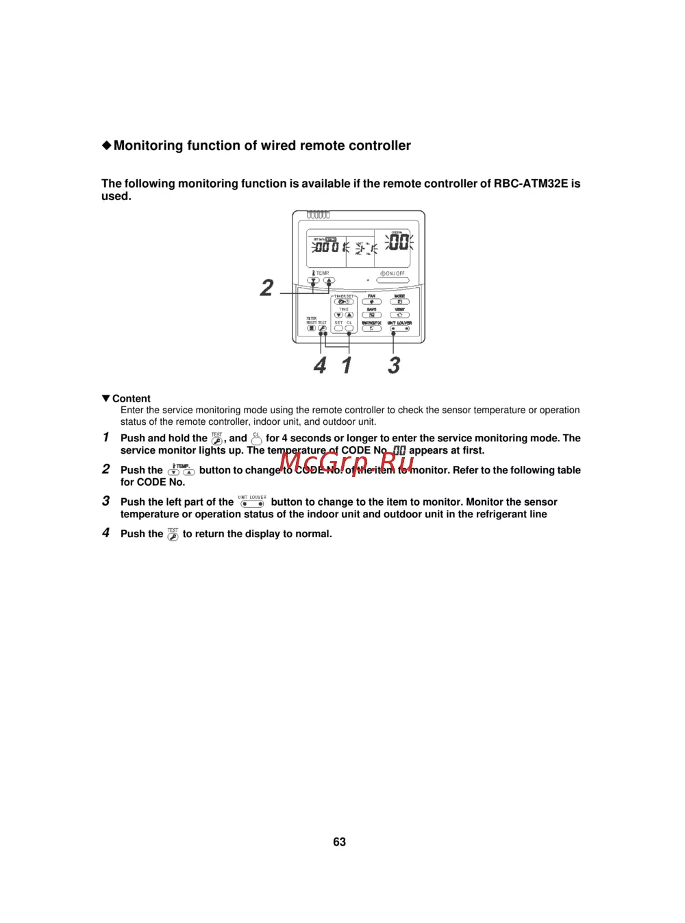 Toshiba MMC-AP0244H-E [64/219] The following monitoring function is available if the remote controller of rbc atm32e is used