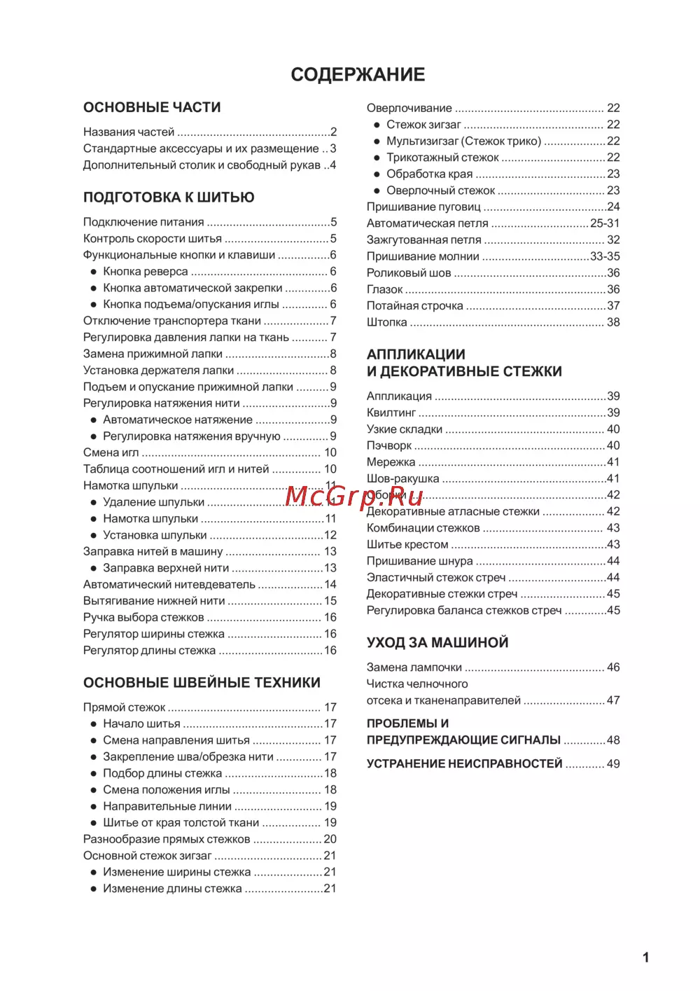 СОДЕРЖАНИЕ ОСНОВНЫЕ ЧАСТИ Названия частей 2 Стандартные аксессуары и их размещение 3 Дополнительный столик и свободный рукав 4 ПОДГОТОВКА К ШИТЬЮ Подключение питания 5 Контроль скорости шитья 5 Функциональные кнопки и клавиши 6 Кнопка реверса 6 Кнопка автоматической закрепки 6 Кнопка подъема опускания иглы 6 Отключение транспортера ткани 7 Регулировка давления лапки на ткань 7 Замена прижимной лапки 8 Установка держателя лапки 8 Подъем и опускание прижимной лапки 9 Регулировка натяжения нити 9 Автоматическое натяжение 9 Регулировка натяжения вручную 9 Смена игл 10 Таблица соотношений игл и нитей 10 Намотка шпульки 11 Удаление шпульки 11 Намотка шпульки 11 Установка шпульки 12 Заправка нитей в машину 13 Заправка верхней нити 13 Автоматический нитевдеватель 14 Вытягивание нижней нити 15 Ручка выбора стежков 16 Оверлочивание 22 Стежок зигзаг 22 Мультизигзаг Стежок трико 22 Трикотажный стежок 22 Обработка края 23 Оверлочный стежок 23 Пришивание пуговиц 24 Автоматическая петля 25 31 Зажгутованная петля 32 Пришивание молнии 33 35 Роликовый шов 36 Глазок 36 Потайная строчка 37 Штопка 38 АППЛИКАЦИИ И ДЕКОРАТИВНЫЕ СТЕЖКИ Аппликация 39 Квилтинг 39 Узкие складки 40 Пэчворк 40 Мережка 41 Шов ракушка 41 Сборки 42 Декоративные атласные стежки 42 Комбинации стежков 43 Шитье крестом 43 Пришивание шнура 44 Эластичный стежок стреч 44 Декоративные стежки стреч 45 Регулировка баланса стежков стреч 45 Регулятор ширины стежка 16 Регулятор длины стежка 16 УХОД ЗА МАШИНОЙ ОСНОВНЫЕ ШВЕЙНЫЕ ТЕХНИКИ Замена лампочки 46 Чистка челночного отсека и тканенаправителей 47 Прямой стежок 17 Начало шитья 17 Смена направления шитья 17 Закрепление шва обрезка нити 17 Подбор длины стежка 18 Смена положения иглы 18 ПРОБЛЕМЫ И ПРЕДУПРЕЖДАЮЩИЕ СИГНАЛЫ 48 УСТРАНЕНИЕ НЕИСПРАВНОСТЕЙ 49 Направительные линии 19 Шитье от края толстой ткани 19 Разнообразие прямых стежков 20 Основной стежок зигзаг 21 Изменение ширины стежка 21 Изменение длины стежка 21 1