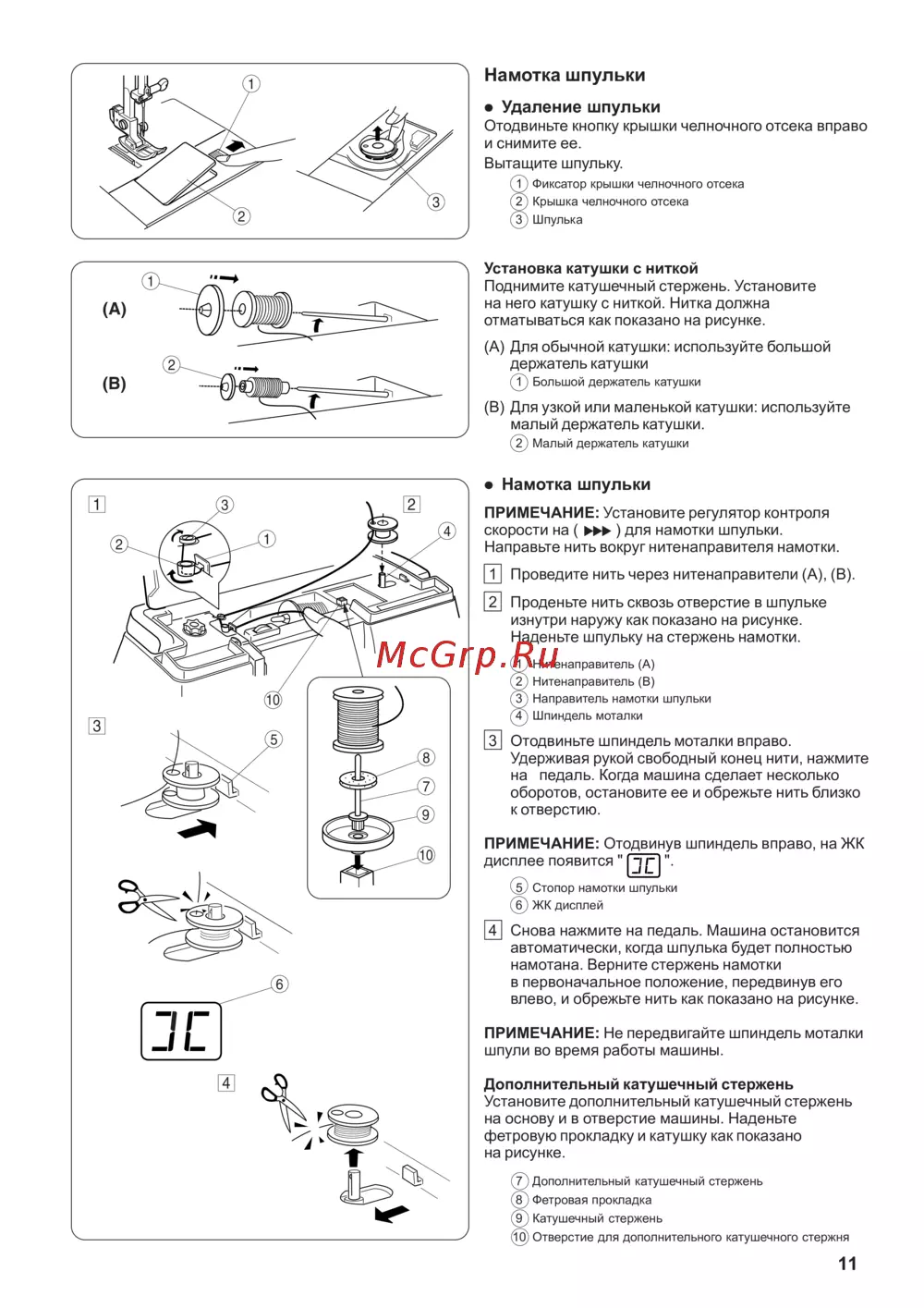 Намотка шпульки Удаление шпульки Отодвиньте кнопку крышки челночного отсека вправо и снимите ее Вытащите шпульку 7 Фиксатор крышки челночного отсека 2 Крышка челночного отсека З Шпулька Установка катушки с ниткой Поднимите катушечный стержень Установите на него катушку с ниткой Нитка должна отматываться как показано на рисунке А Для обычной катушки используйте большой держатель катушки 7 Большой держатель катушки В Для узкой или маленькой катушки используйте малый держатель катушки Малый держатель катушки Намотка шпульки ПРИМЕЧАНИЕ Установите регулятор контроля скорости на для намотки шпульки Направьте нить вокруг нитенаправителя намотки Ш Проведите нить через нитенаправители А В Проденьте нить сквозь отверстие в шпульке изнутри наружу как показано на рисунке Наденьте шпульку на стержень намотки Т Нитенаправитель А 2 Нитенаправитель В 3 Направитель намотки шпульки 4 Шпиндель моталки з Отодвиньте шпиндель моталки вправо Удерживая рукой свободный конец нити нажмите на педаль Когда машина сделает несколько оборотов остановите ее и обрежьте нить близко к отверстию ПРИМЕЧАНИЕ Отодвинув шпиндель вправо на ЖК дисплее появится Стопор намотки шпульки б ЖК дисплей Щ Снова нажмите на педаль Машина остановится автоматически когда шпулька будет полностью намотана Верните стержень намотки в первоначальное положение передвинув его влево и обрежьте нить как показано на рисунке ПРИМЕЧАНИЕ Не передвигайте шпиндель моталки шпули во время работы машины Дополнительный катушечный стержень Установите дополнительный катушечный стержень на основу и в отверстие машины Наденьте фетровую прокладку и катушку как показано на рисунке 7 Дополнительный катушечный стержень 8 Фетровая прокладка 9 Катушечный стержень 10 Отверстие для дополнительного катушечного стержня 11
