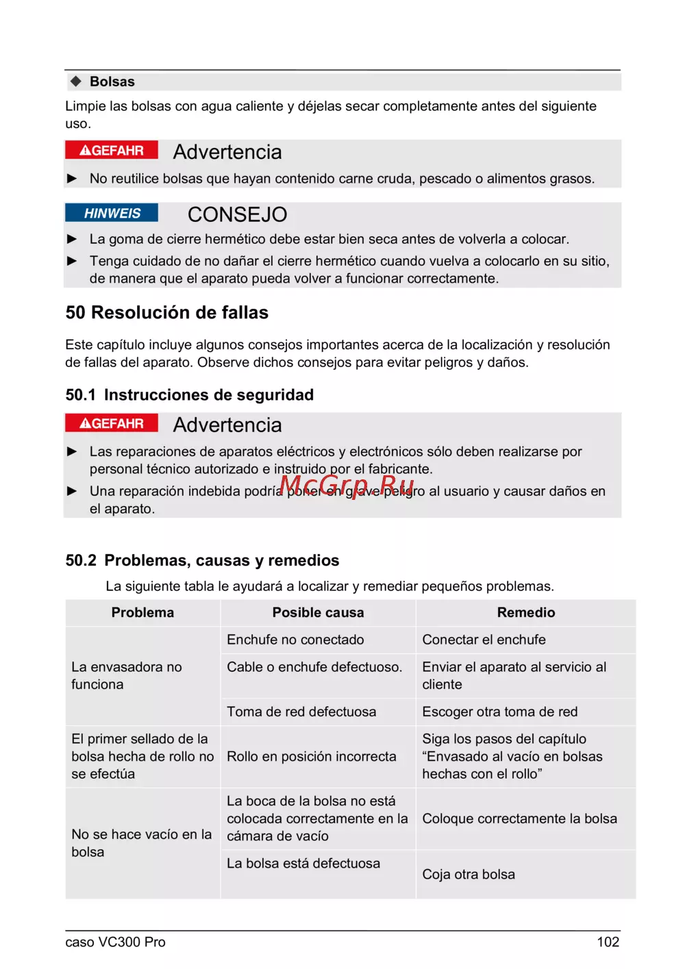 Caso VC 300 — guía de uso y solución de problemas para envasadoras al vacío [102/125]