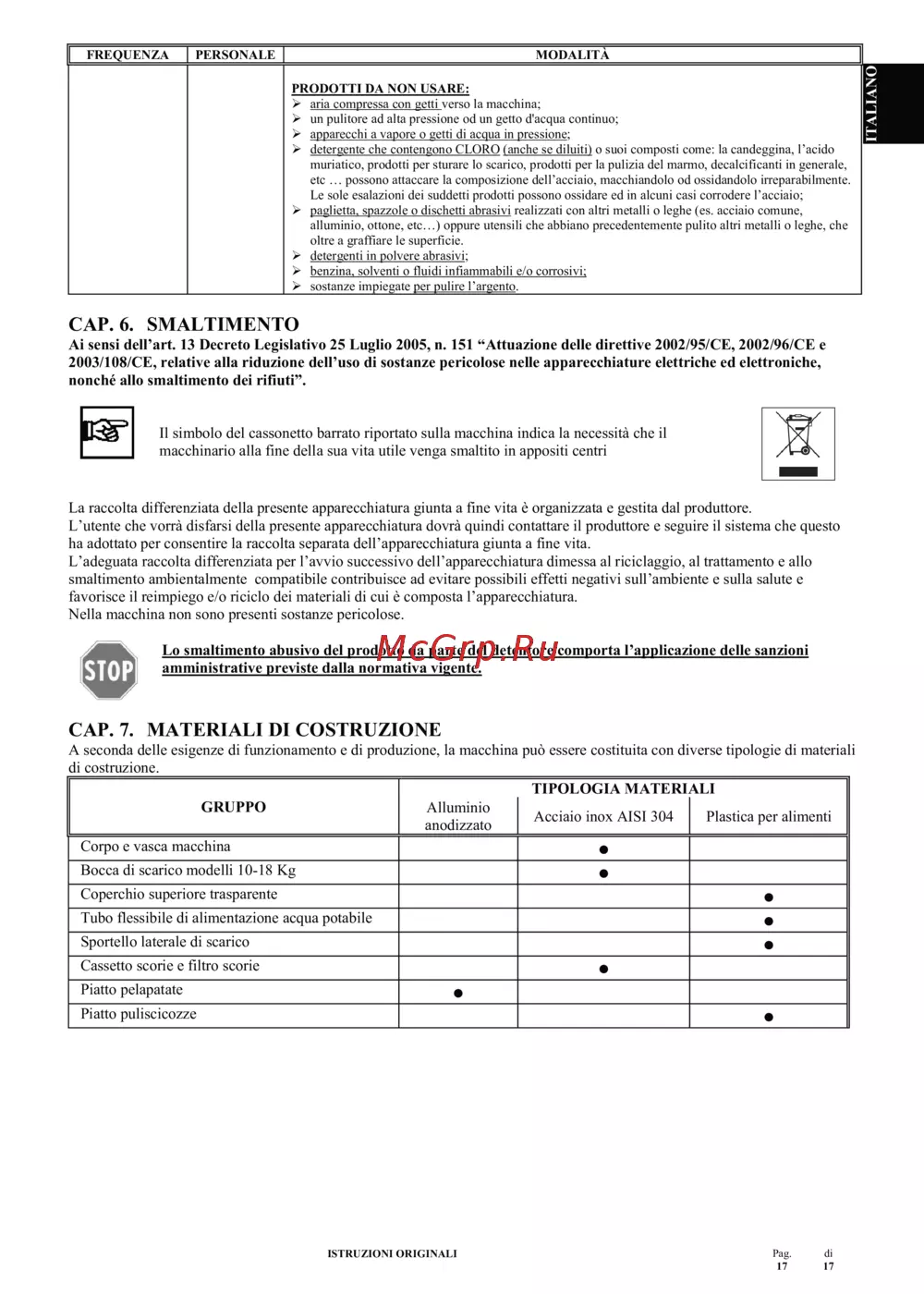 - Cap 1 organizzazione del contenuto e modalità di consultazione 3 cap 2 informazioni generali e caratteristiche 4 cap 3 istruzioni per la sicurezza 8 cap 4 trasporto messa in servizio ed uso 10 cap 5 manutenzione ricerca guasti e pulizia 15 cap 6 smaltimento 17 cap 7 materiali di costruzione 17 p.2
