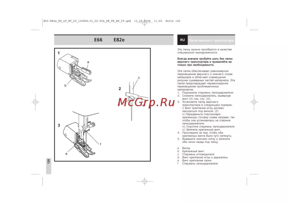 Е55 Е82е_ЕП_ЬТ_ЕТ_Ь7_130808 01 55 90е_БЕ_ЕЕ_Е5 1Т дхб 13 08 Е66 Е82е 08 11 55 ЗелЛе 120 ии Эту лапку можно приобрести в качестве специальной принадлежности Всегда вначале пробуйте шить без лапки верхнего транспортера и применяйте ее только при необходимости Эта лапка обеспечивает равномерное перемещение верхнего и нижнего слоев материала и облегчает совмещение рисунка сшиваемых частей материала Эта лапка предотвращает неравномерное перемещение проблематичных материалов 1 Поднимите стержень лапкодержателя 2 Снимите лапкодержатель вывернув винт 3 см стр 32 3 Установите лапку верхнего транспортера в следующем порядке Винт крепления иглы должен находиться под вилкой 2 и Передвиньте пластиковую крепежную головку слева направо так чтобы она установилась на стержне лапкодержателя ш Опустите стержень лапкодержателя IV Затяните крепежный винт 4 Проследите за тем чтобы оба крепежных винта были туго затянуты 5 Выведите нижнюю нитку и затяните обе нитки назад под лапку а Вилка Ь Крепежный винт с Стержень игловодителя б Винт крепления иглы и держатель е Винт крепления лапки Стержень лапкодержателя