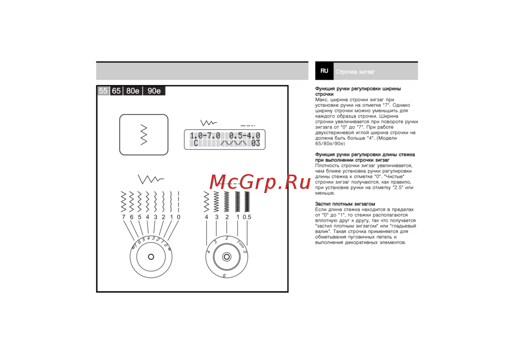 пи 55 65 80е 90е Л Функция ручки регулировки ширины строчки Макс ширина строчки зигзаг при установке ручки на отметке 7 Однако ширину строчки можно уменьшить для каждого образца строчки Ширина строчки увеличивается при повороте ручки зигзага от О до 7 При работе двухстержневой иглой ширина строчки не должна быть больше 4 Модели 65 80е 90е Функция ручки регулировки длины стежка при выполнении строчки зигзаг Плотность строчки зигзаг увеличивается чем ближе установка ручки регулировки длины стежка к отметке О Чистые строчки зигзаг получаются как правило при установке ручки на отметку 2 5 или меньше Застил плотным зигзагом Если длина стежка находится в пределах от О до 1 то стежки располагаются вплотную друг к другу так что получается застил плотным зигзагом или гладьевый валик Такая строчка применяется для обметывания пуговичных петель и выполнения декоративных элементов