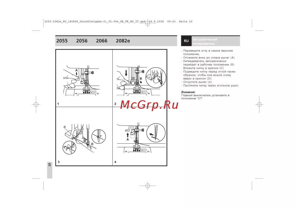 2055 20 8 2е_ЕП_18080 8_Druckfге1даЬе 01_55 9 0е_БЕЕЕ_ЕЗ_1Т дха 2055 2056 2066 2082е 8 8 2008 09 43 Sei Ce 20 ии Переведите иглу в самое верхнее положение Отожмите вниз до отказа рычаг А Нитевдеватель автоматически перейдет в рабочее положение В Вложите нитку в крючок С Подведите нитку перед иглой таким образом чтобы она вошла снизу вверх в крючок О Отпустите рычаг А Протяните нитку через игольное ушко Внимание Гпавный выключатель установите в положение О