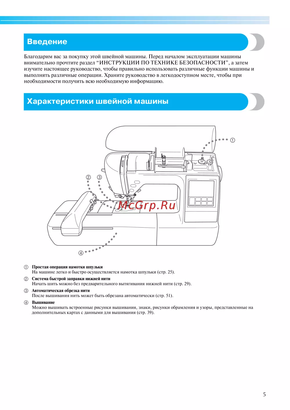 - Благодарим вас за покупку этой швейной машины перед началом эксплуатации машины внимательно прочтите раздел инструкции по технике безопасности а затем изучите настоящее руководство чтобы правильно использовать различные функции машины и выполнять различные операции храните руководство в легкодоступном месте чтобы при необходимости получить всю необходимую информацию p.7