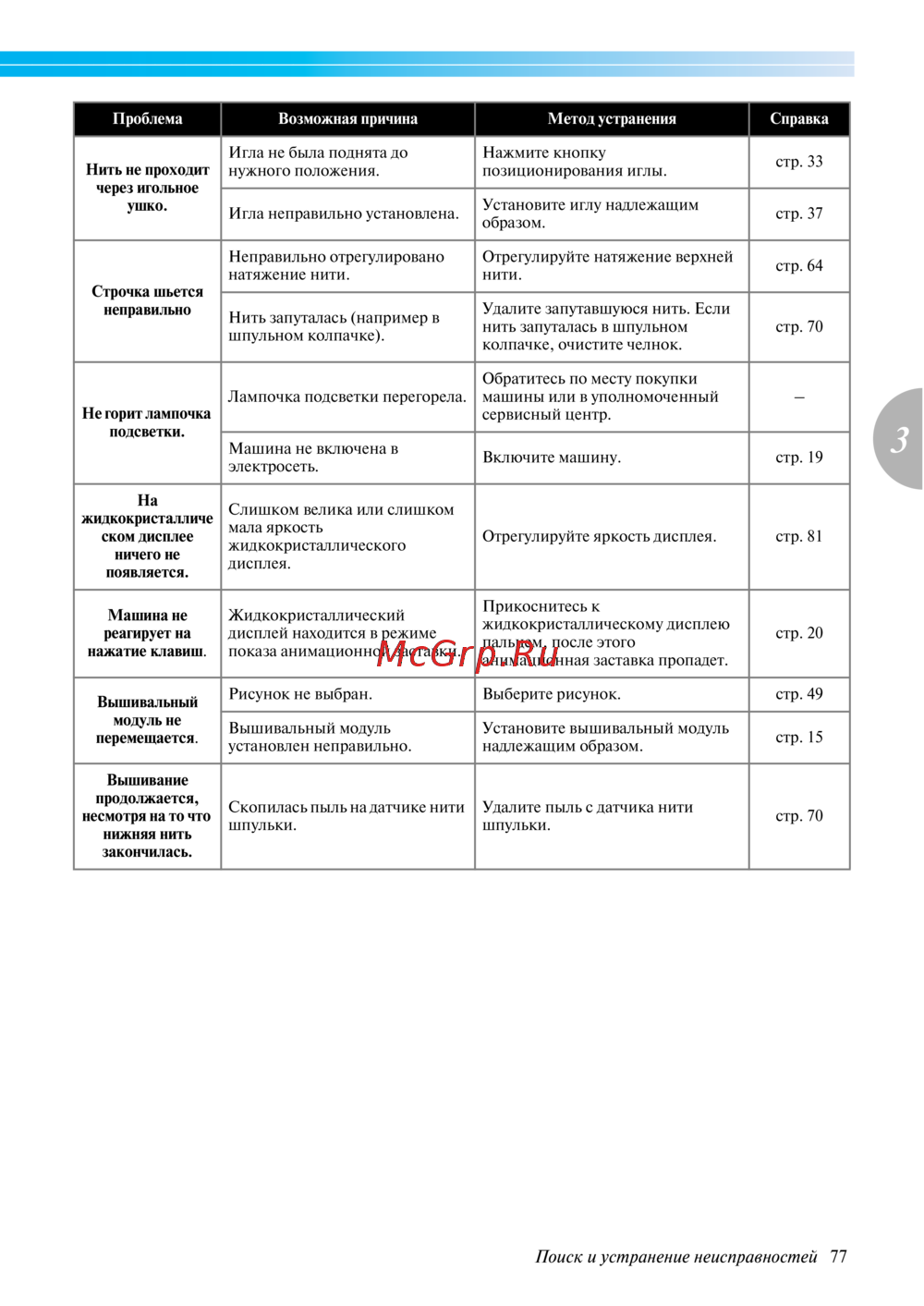 - Если машина перестала нормально работать то перед тем как обратиться за помощью в сервисный центр выполните следующие проверки если проблема остается обратитесь по месту покупки машины или в ближайший уполномоченный сервисный центр p.76