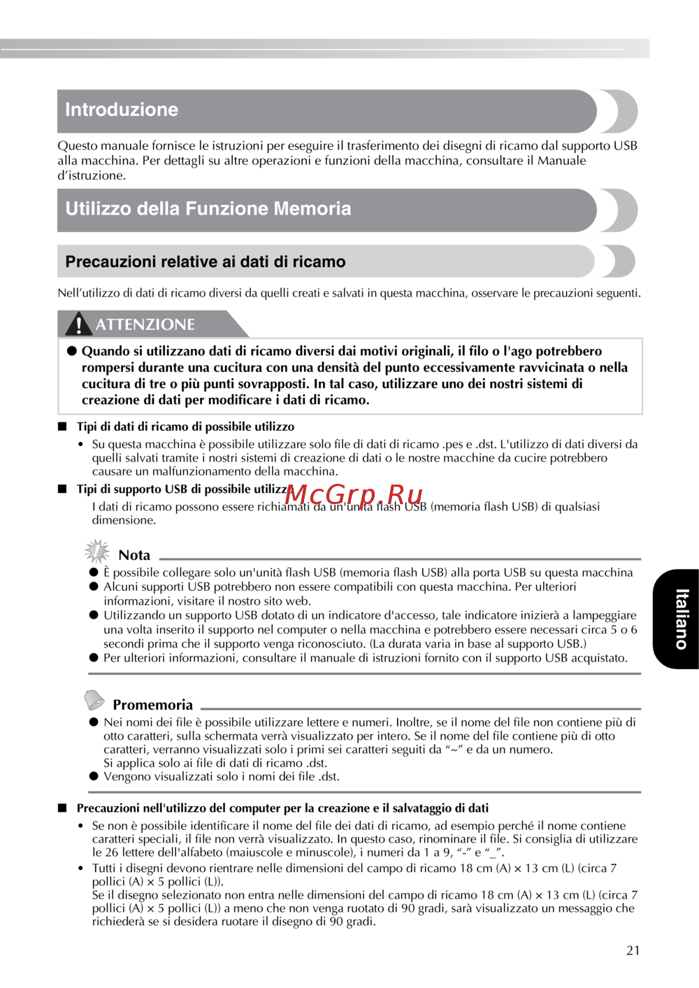 Questo manuale fornisce le istruzioni per eseguire il trasferimento dei disegni di ricamo dal supporto USB