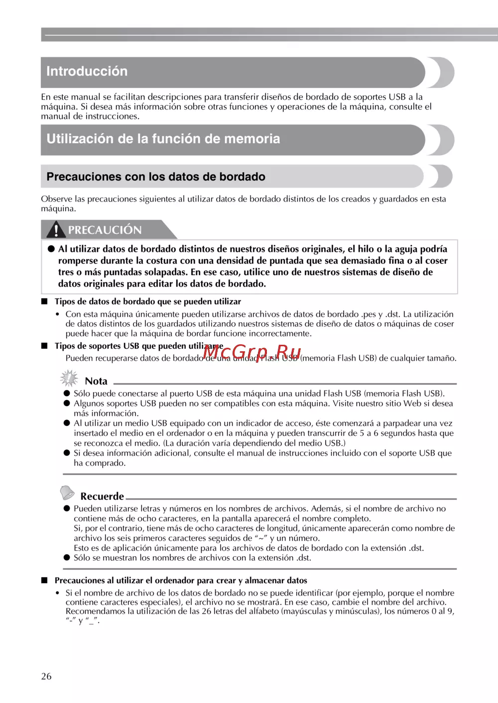 - Transferencia de diseños de bordado del ordenador a la máquina p.29