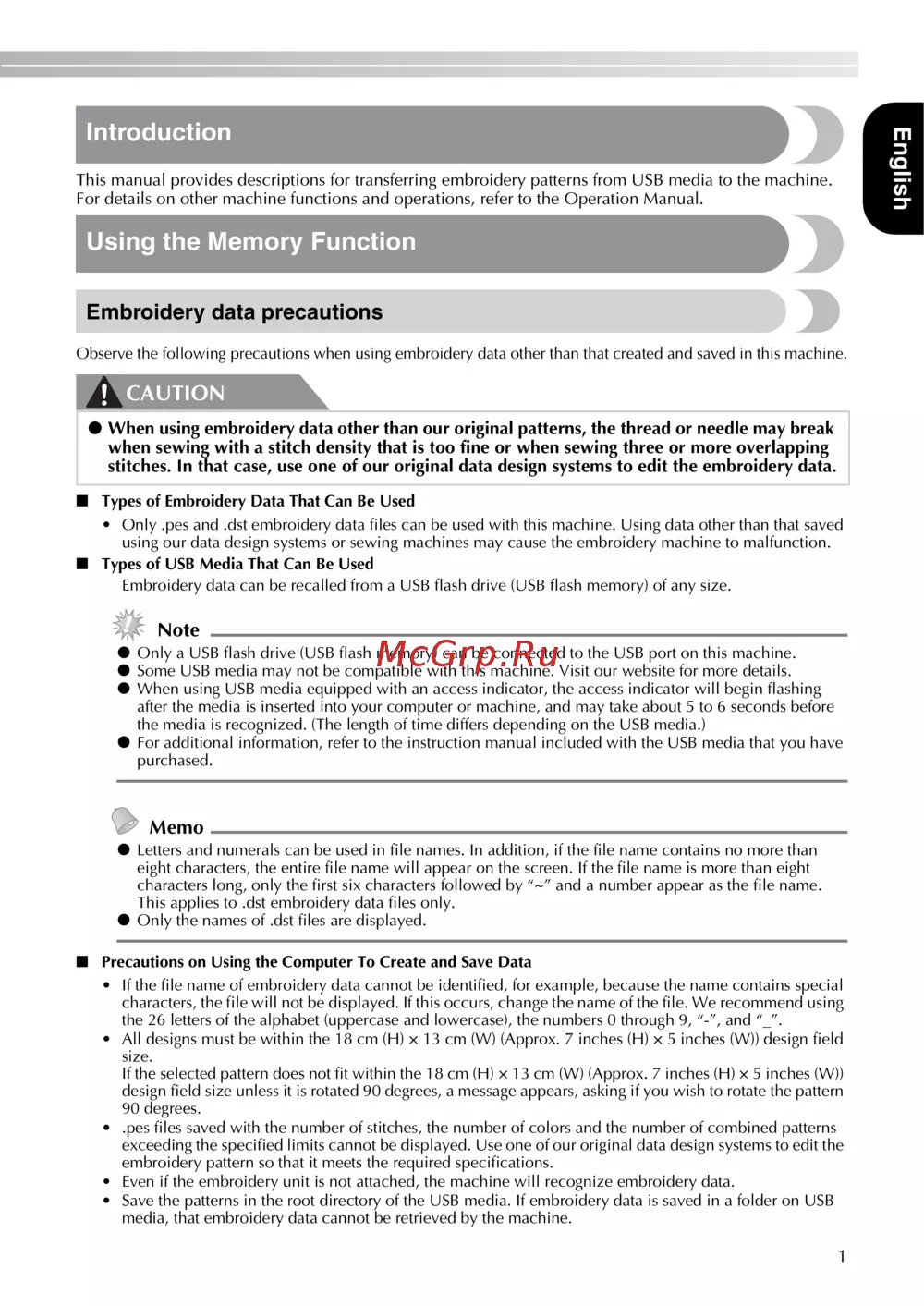 • Only .pes and .dst embroidery data files can be used with this machine. Using data other than that saved