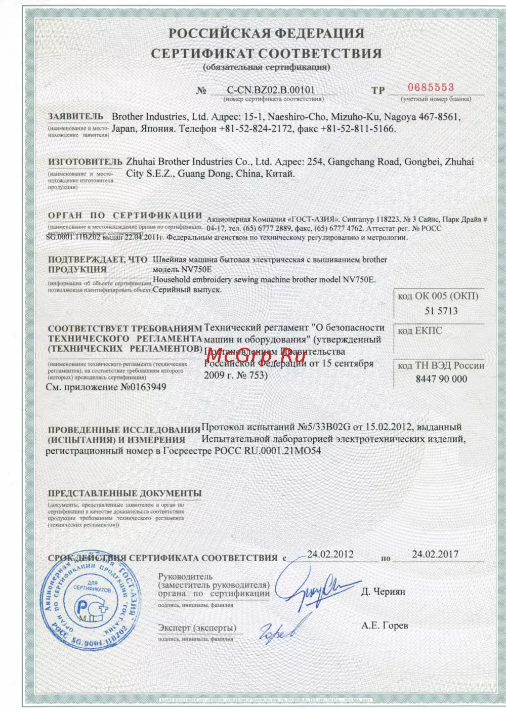 Brother INNOV-'IS NV-750E — сертификат соответствия для швейных машин в России [1/2]
