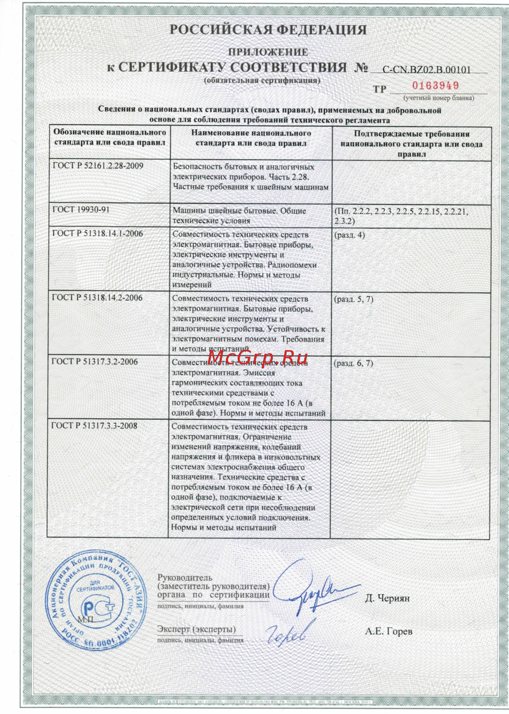 РОССИЙСКАЯ ФЕДЕРАЦИЯ ПРИЛОЖЕНИЕ к СЕРТИФИКАТУ СООТВЕТСТВИЯ обязательная сертификация 0163949 ТР учетный номер бланка Сведения о национальных стандартах сводах правил применяемых на добровольной основе для соблюдения требований технического регламента Обозначение национального Наименование национального Подтверждаемые требования стандарта или свода правил стандарта или свода правил национального стандарта или свода правил ГОСТ Р 52161 2 28 2009 Безопасность бытовых и аналогичных электрических приборов Часть 2 28 Частные требования к швейным машинам ГОСТ 19930 91 Машины швейные бытовые Общие технические условия Пп 2 2 2 2 2 3 2 2 5 2 2 15 2 2 21 2 3 2 ГОСТ Р 51318 14 1 2006 Совместимость технических средств электромагнитная Бытовые приборы электрические инструменты и аналогичные устройства Радиопомехи индустриальные Нормы и методы измерений разд 4 ГОСТ Р 51318 14 2 2006 Совместимость технических средств разд 5 7 электромагнитная Бытовые приборы электрические инструменты и аналогичные устройства Устойчивость к электромагнитным помехам Требования и методы испытаний ГОСТ Р 51317 3 2 2006 Совместимость технических средств разд 6 7 электромагнитная Эмиссия гармонических составляющих тока техническими средствами с потребляемым током не более 16 А в одной фазе Нормы и методы испытаний ГОСТ Р 51317 3 3 2008 Совместимость технических средств электромагнитная Ограничение изменений напряжения колебаний напряжения и фликера в низковольтных системах электроснабжения общего назначения Технические средства с потребляемым током не более 16 А в одной фазе подключаемые к электрической сети при несоблюдении определенных условий подключения Нормы и методы испытаний Д Чериян Эксперт эксперты подпись инициалы фамилия А Е Горев