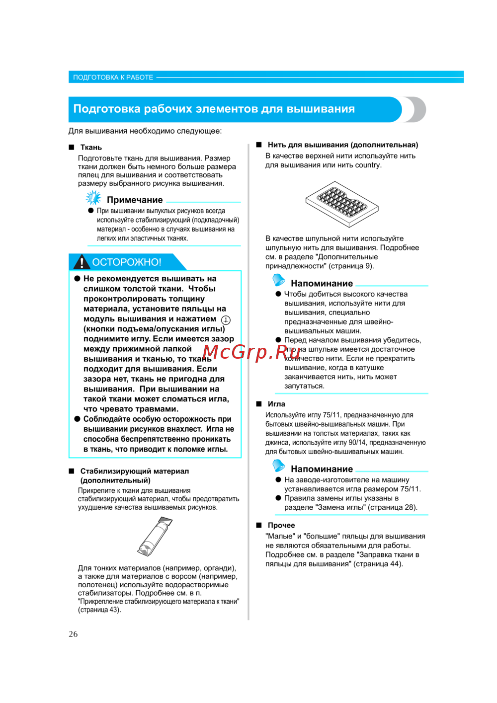 ![Brother INNOV-'IS NV-90E [28/92] Соблюдайте особую осторожность при вышивании рисунков внахлест игла не способна беспрепятственно проникать в ткань что приводит к поломке иглы](/views2/1026301/page28/bg1c.png)