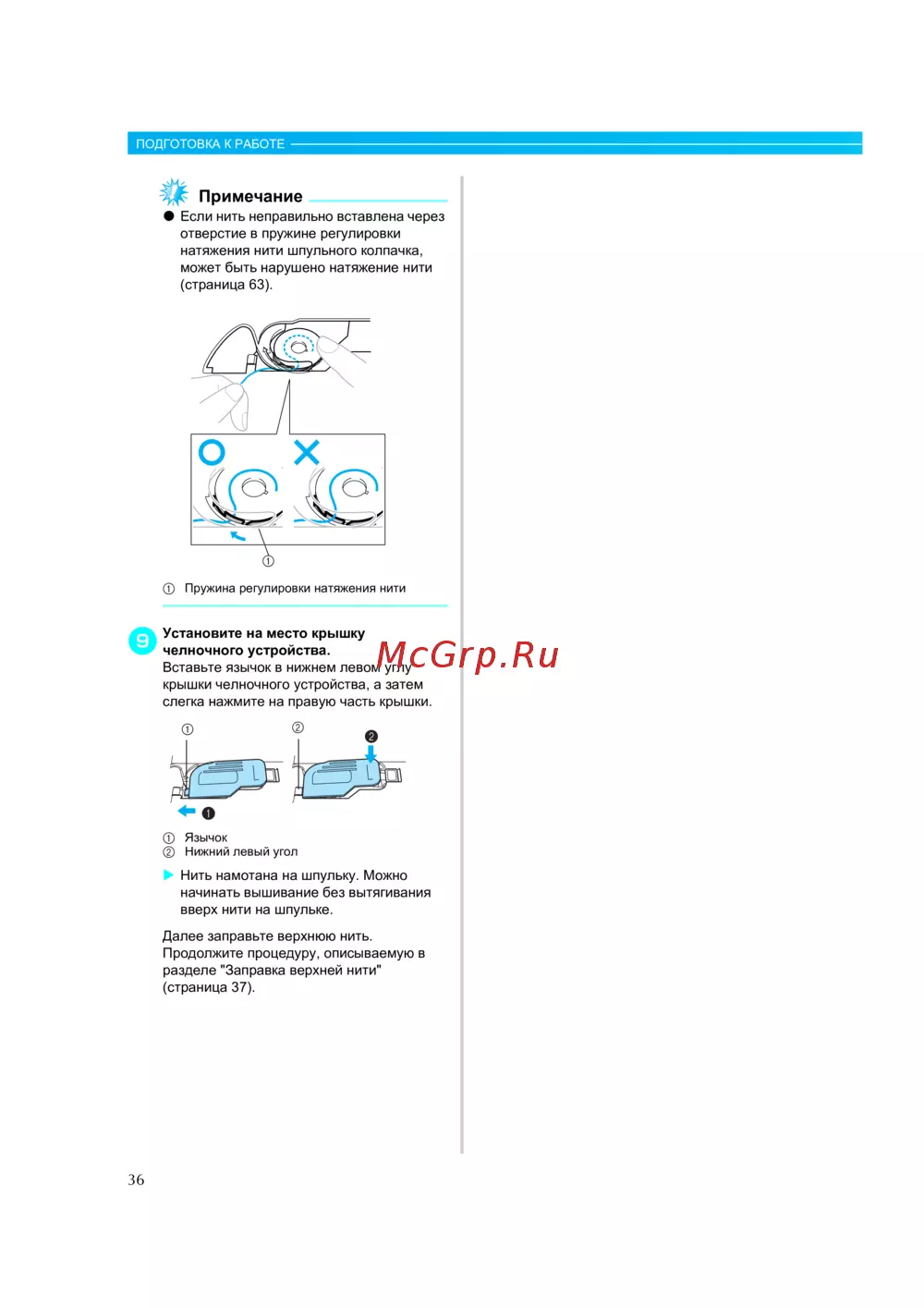 - Перед началом вышивания убедитесь что на шпульке имеется количество нити достаточное для работы если выполнять вышивание при отсутствии достаточного количества нити на шпульке возможно запутывание нити p.59