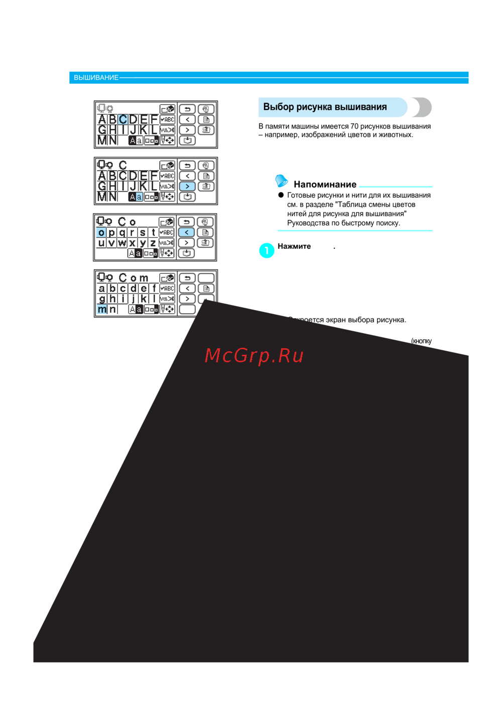 - Вышивание рисунков выполняется со сменой нити при каждой замене цвета p.59