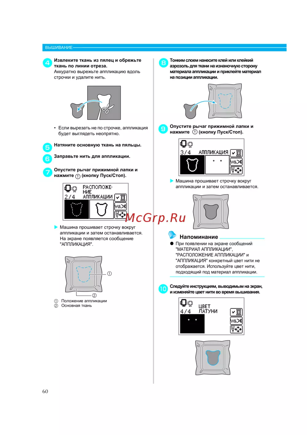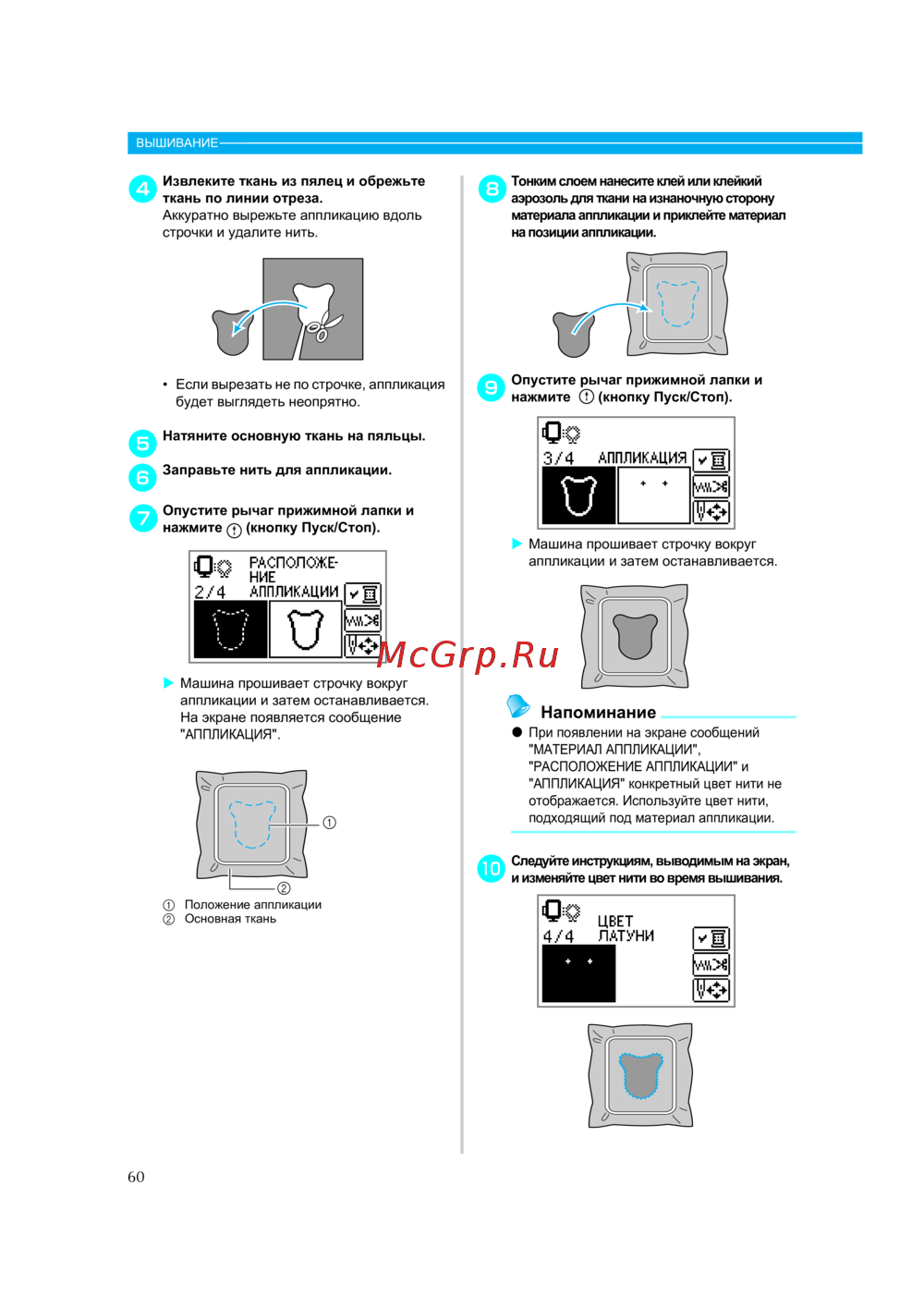 - Вышивание рисунков выполняется со сменой нити при каждой замене цвета p.59