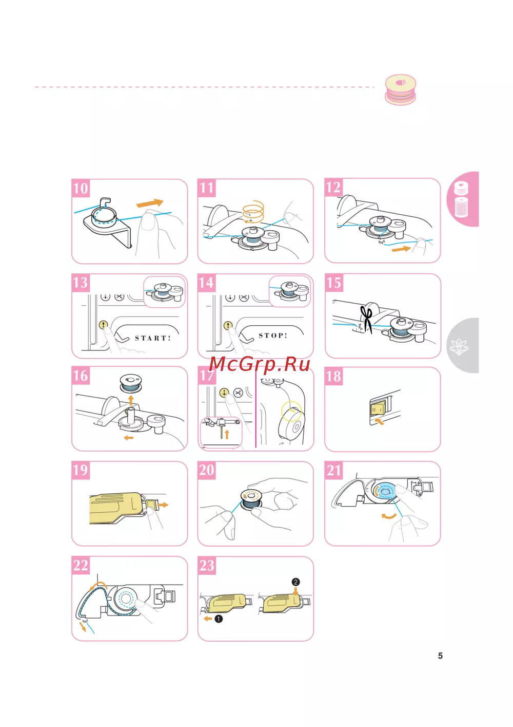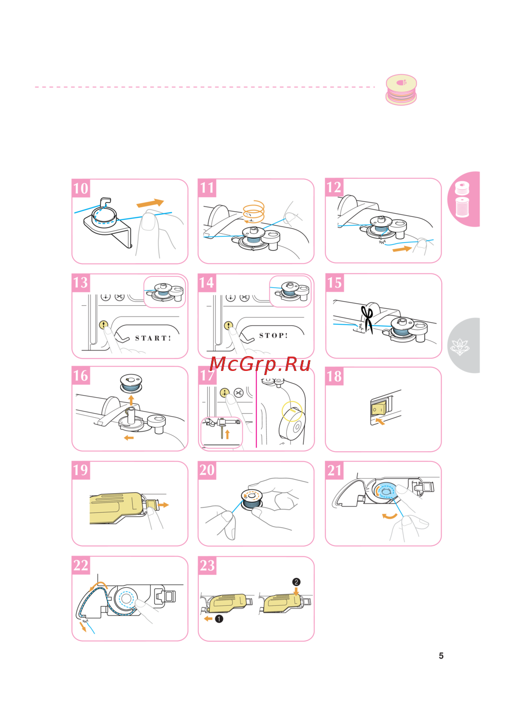 - Bobbin winding and setting aufspulen des unterfadens und einstellung bobinage et réglage de la canette opwinden en instellen van de spoel avvolgimento spolina e caricamento bobinado y ajuste p.6