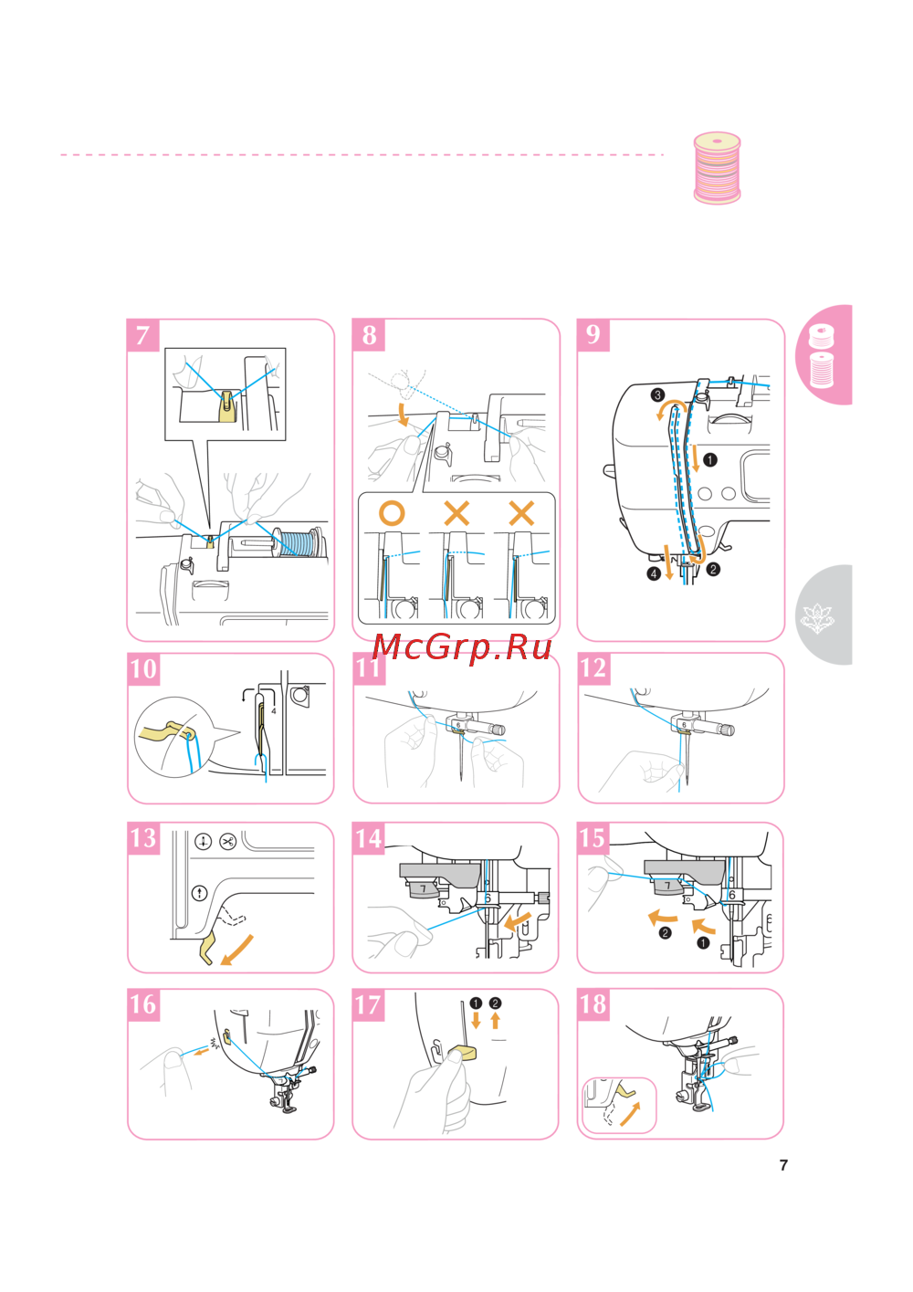 - Bobbin winding and setting aufspulen des unterfadens und einstellung bobinage et réglage de la canette opwinden en instellen van de spoel avvolgimento spolina e caricamento bobinado y ajuste p.6