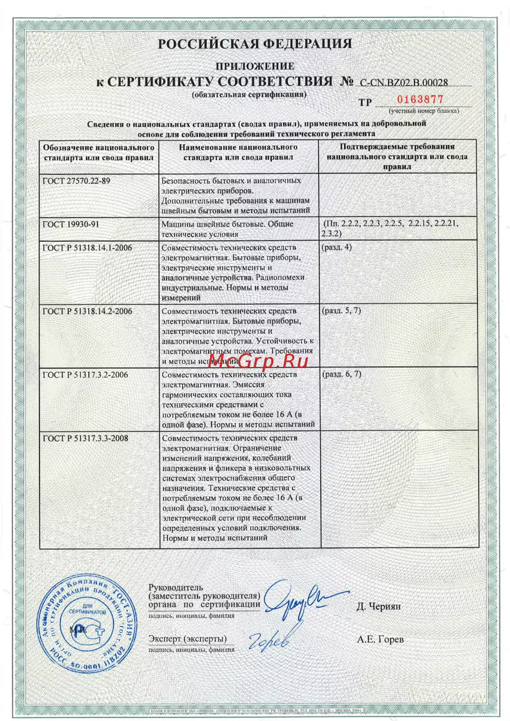 РОССИЙСКАЯ ФЕДЕРАЦИЯ ПРИЛОЖЕНИЕ к СЕРТИФИКАТУ СООТВЕТСТВИЯ с см В2О2 в ооо28 обязательная сертификация 0163877 учетами номер бланка Сведения о национальных стандартах сводах правил применяемых на добровольной основе для соблюдения требований технического регламента_______ Подтверждаемые требования Наименование национального Обозначение национального национального стандарта или свода стандарта или свода правил стандарта или свода правил правил ГОСТ 27570 22 89 Безопасность бытовых и аналогичных электрических приборов Дополнительные требования к машинам швейным бытовым и методы испытаний ГОСТ 19930 91 Машины швейные бытовые Общие технические условия Пп 2 2 2 2 2 3 2 2 5 2 2 15 2 2 21 2 3 2 ГОСТ Р 51318 14 1 2006 Совместимость технических средств электромагнитная Бытовые приборы электрические инструменты и аналогичные устройства Радиопомехи индустриальные Нормы и методы измерений разд 4 ГОСТ Р 51318 14 2 2006 разд 5 7 Совместимость технических средств электромагнитная Бытовые приборы электрические инструменты и аналогичные устройства Устойчивость к электромагнитным помехам Требования и методы испытаний ГОСТ Р 51317 3 2 2006 разд 6 7 Совместимость технических средств электромагнитная Эмиссия гармонических составляющих тока техническими средствами с потребляемым током не более 16 А в одной фазе Нормы и методы испытаний ГОСТ Р 51317 3 3 2008 Совместимость технических средств электромагнитная Ограничение изменений напряжения колебаний напряжения и фликера в низковольтных системах электроснабжения общего назначения Технические средства с потребляемым током не более 16 А в одной фазе подключаемые к электрической сети при несоблюдении определенных условий подключения Нормы и методы испытаний Руководитель заместитель руководителя органа по сертификации СЕРТИФИКАТОВ подпись инициалы фамилия Эксперт эксперты подпись инициалы фамилия Д Чериян