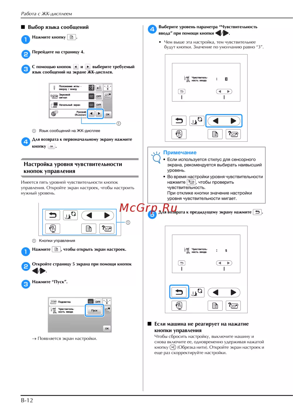 Brother INNOV-IS NV F440E (F 440 E) — настройка ЖК-дисплея: выбор языка и чувствительности кнопок [22/100]
