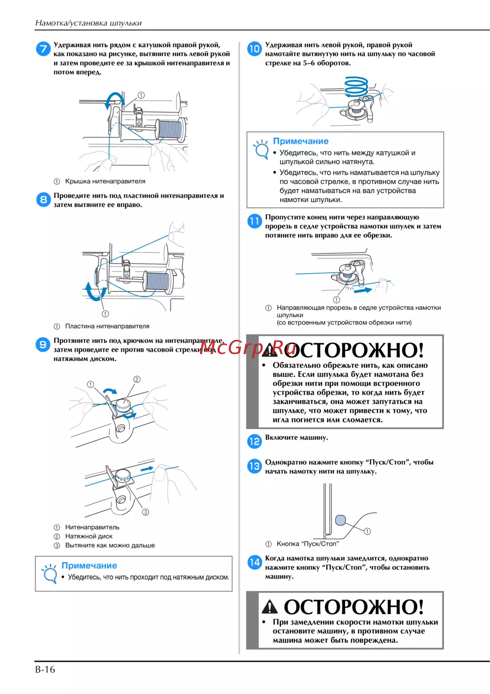 - Убедитесь в правильной установке шпульного колпачка в противном случае возможна поломка иглы p.88