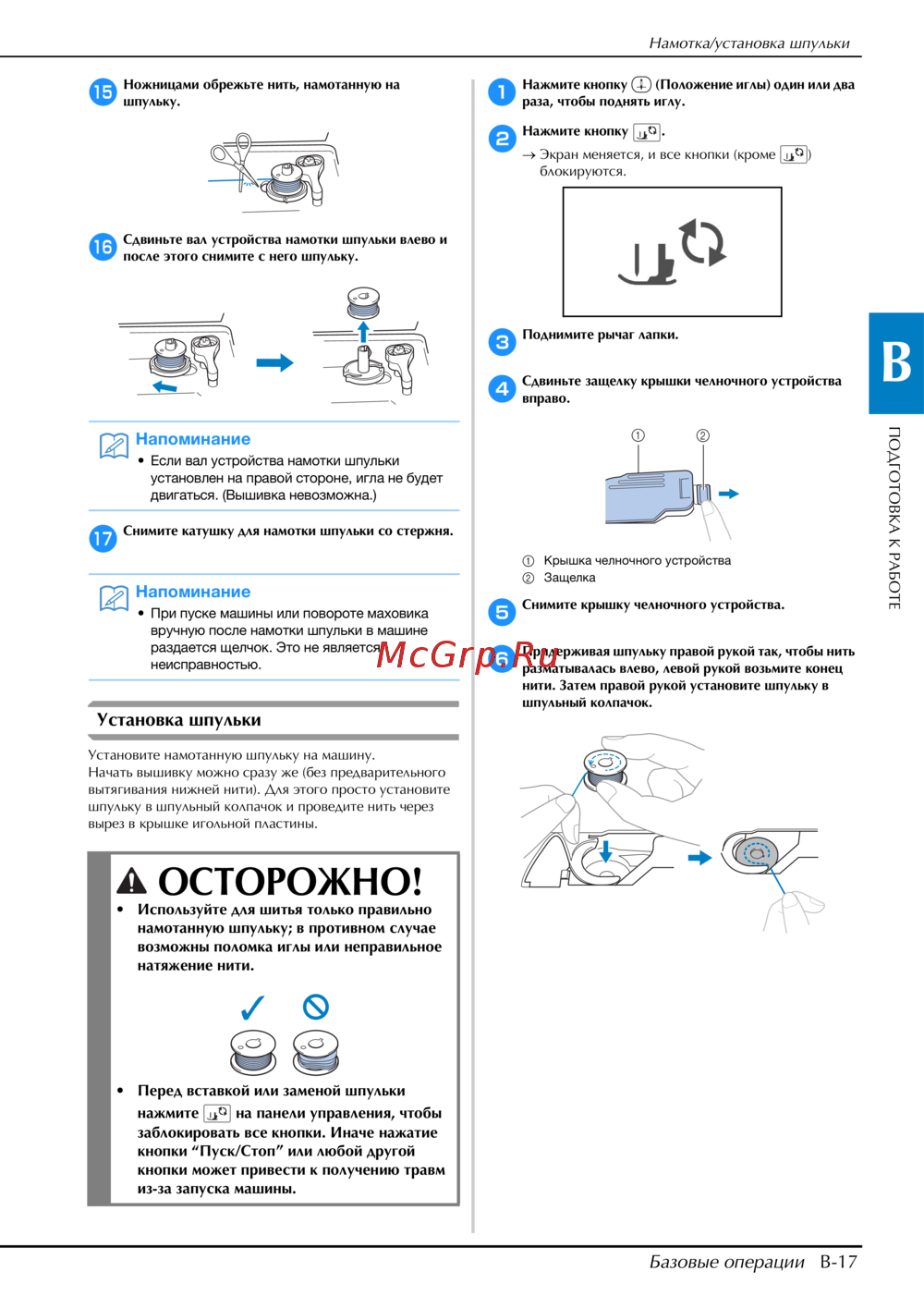 - Убедитесь в правильной установке шпульного колпачка в противном случае возможна поломка иглы p.88