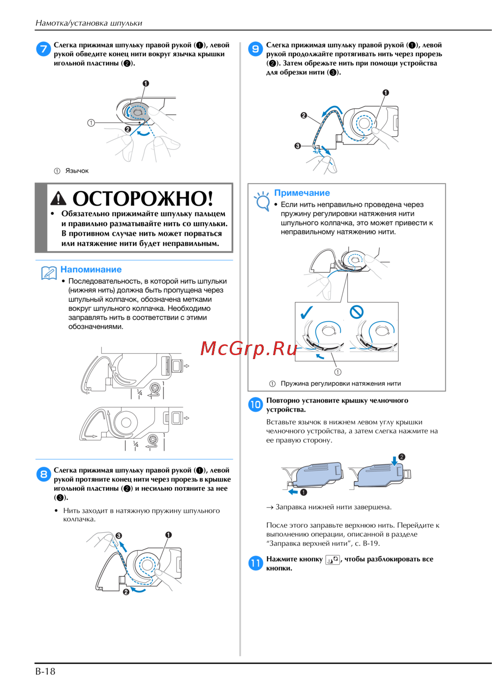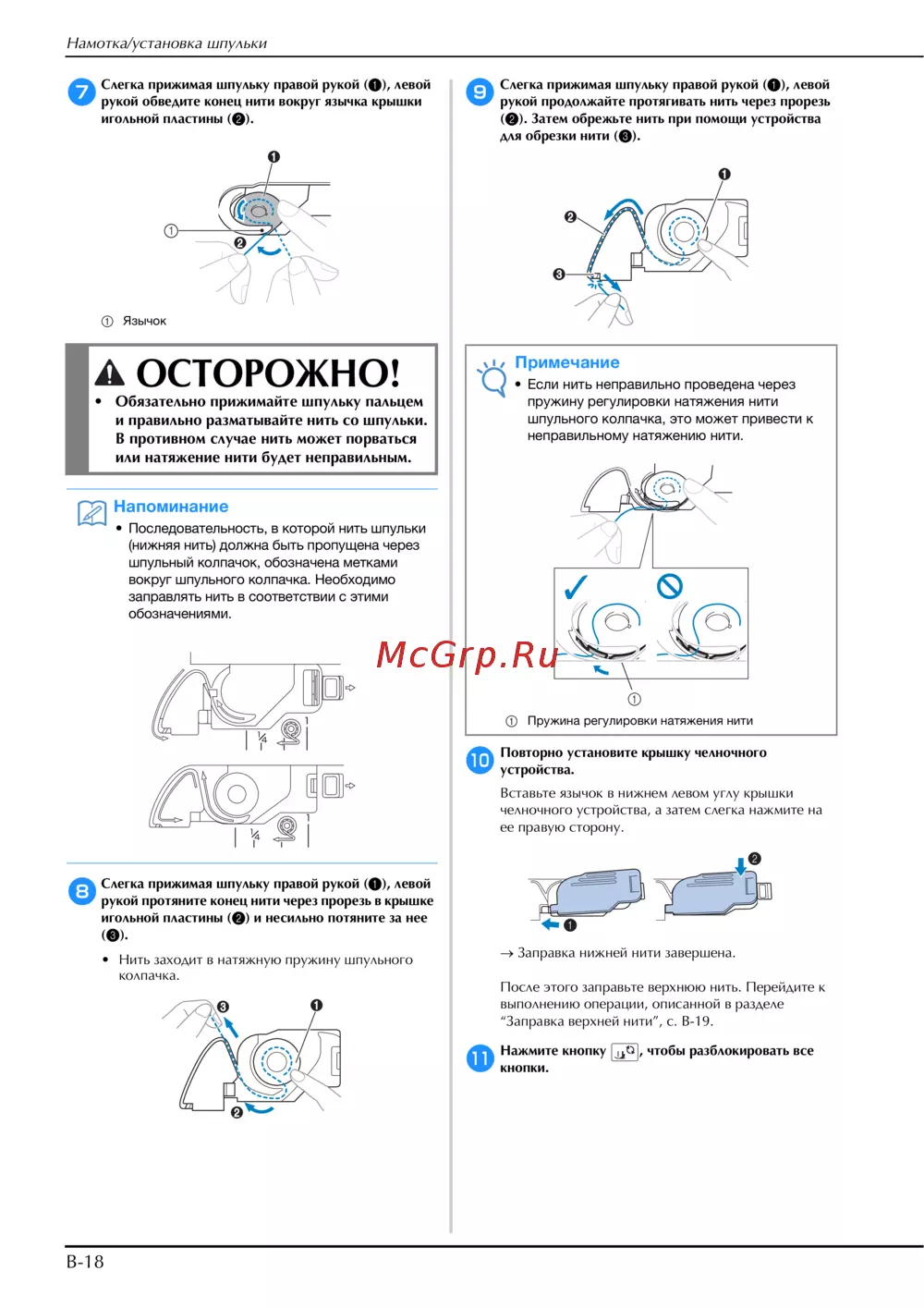 - Убедитесь в правильной установке шпульного колпачка в противном случае возможна поломка иглы p.88