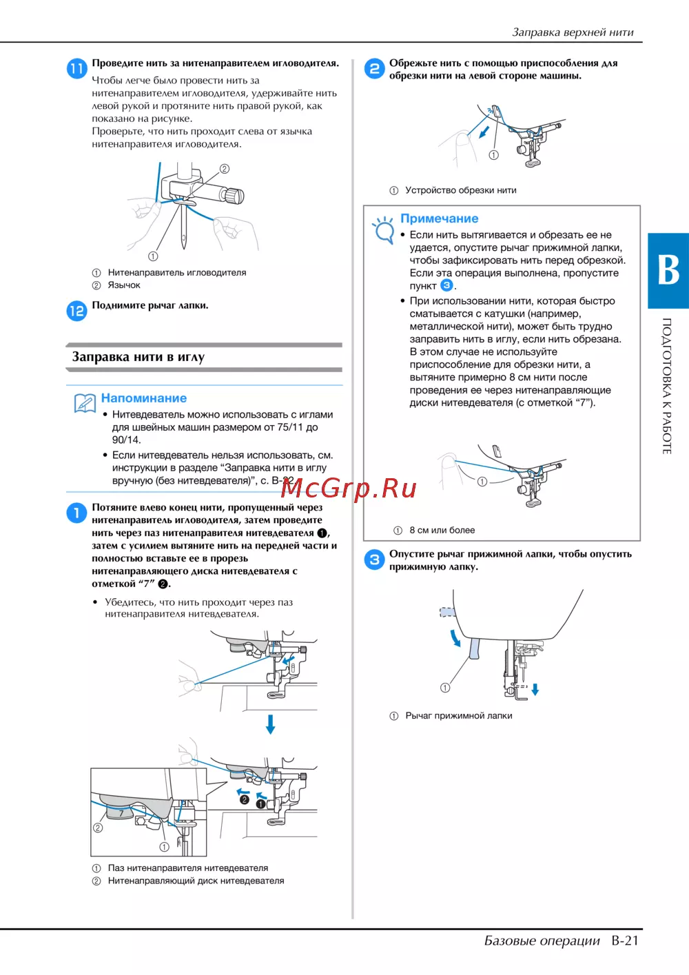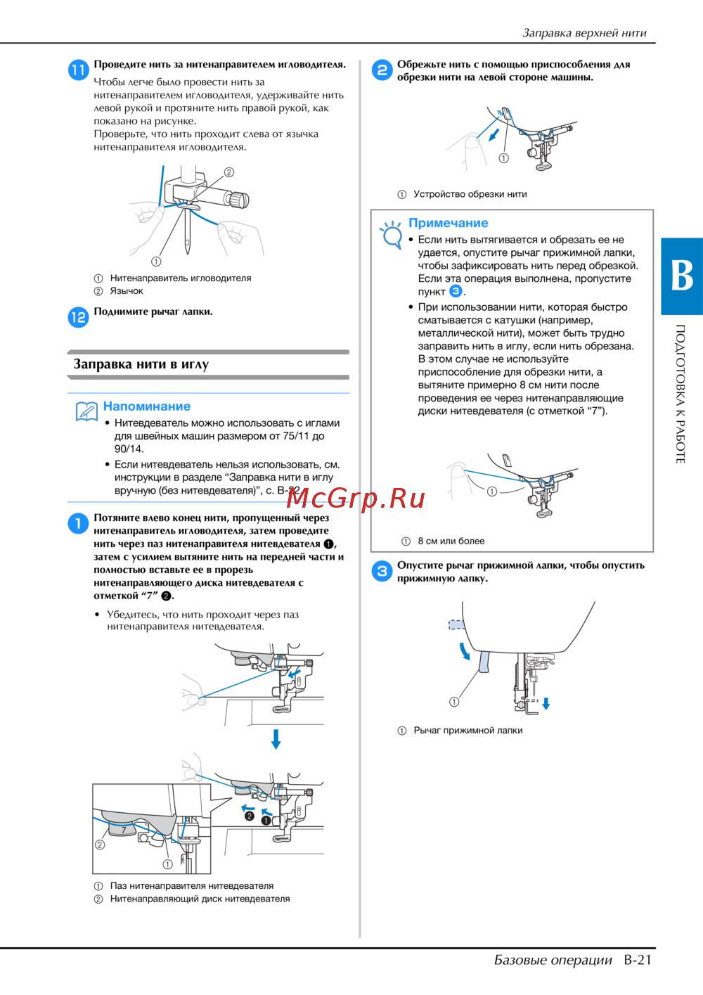 - Убедитесь в правильной установке шпульного колпачка в противном случае возможна поломка иглы p.88