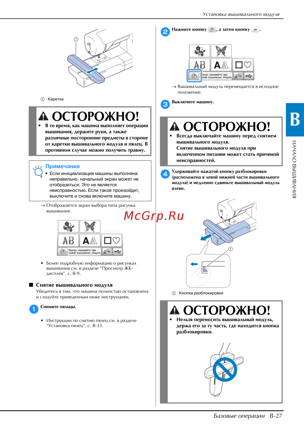 Узнайте, как правильно установить и снять вышивальный модуль. Следуйте простым инструкциям для безопасного выполнения операций вышивания и избегайте травм.