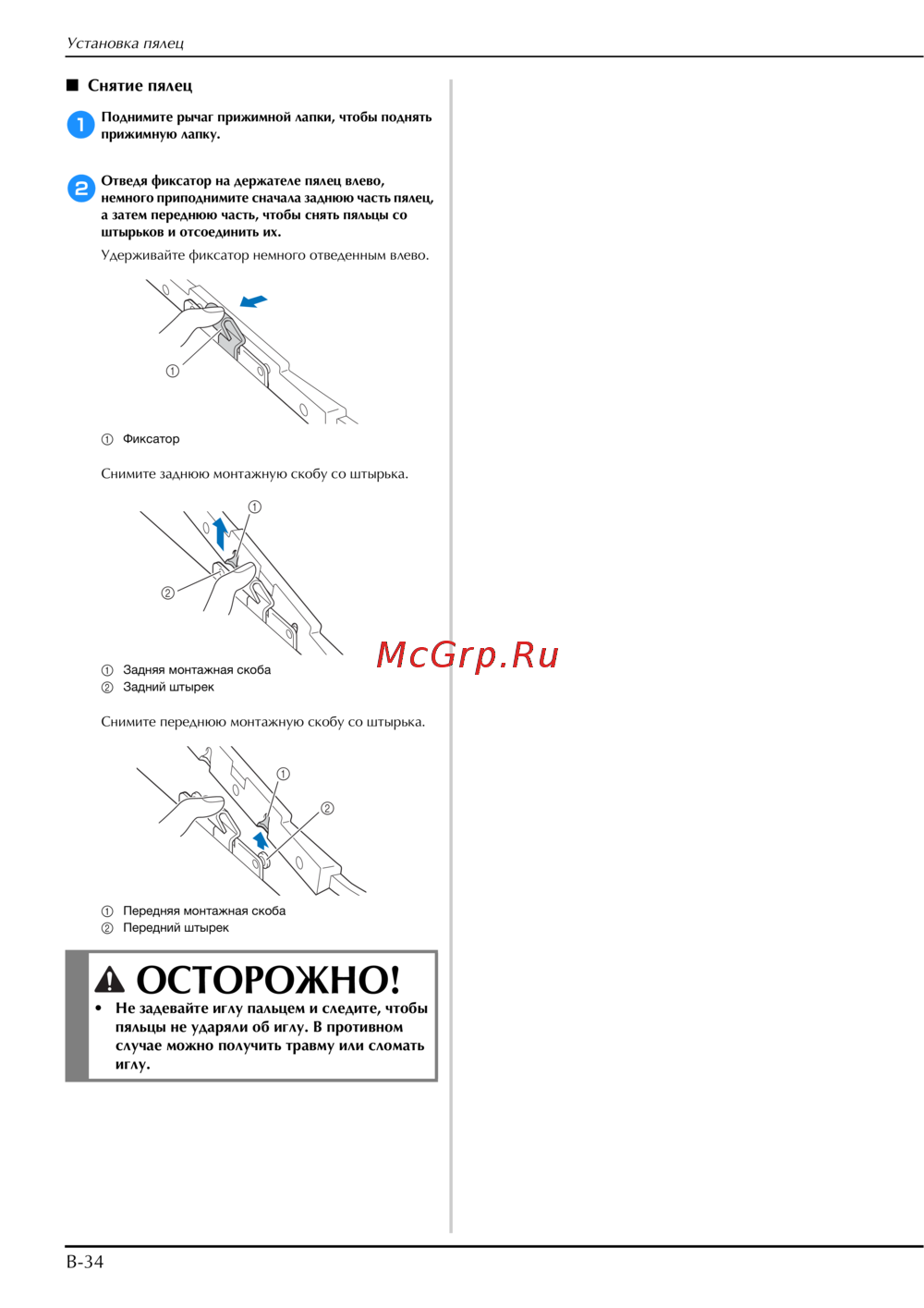 - Убедитесь в правильной установке шпульного колпачка в противном случае возможна поломка иглы p.88