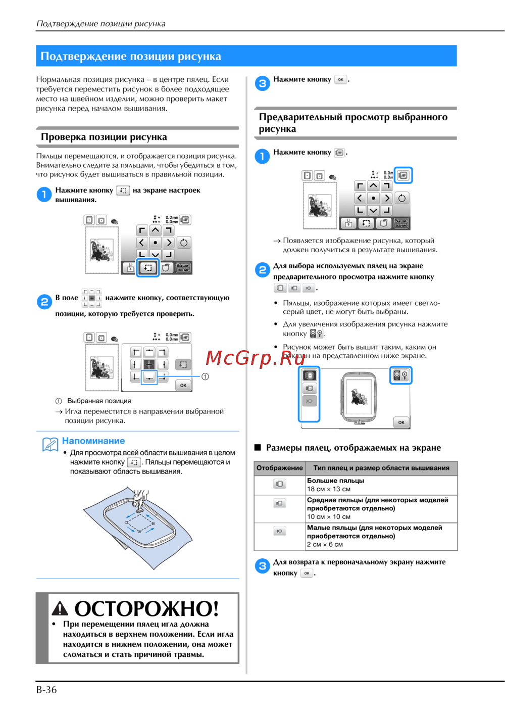 - Меры предосторожности при работе с данными вышивания p.79
