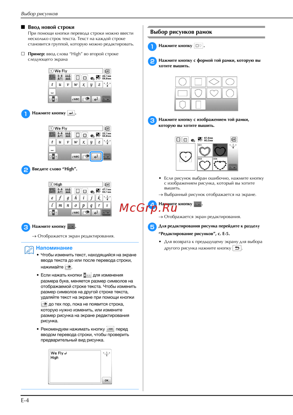 Узнайте, как вводить текст и выбирать рисунки для вышивки. Пошаговое руководство по редактированию и изменению размеров символов на экране.