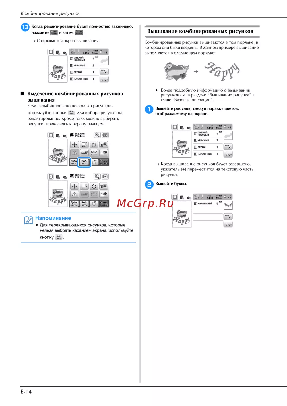 Узнайте, как комбинировать и вышивать рисунки, используя экран. Следуйте порядку цветов и завершите вышивание с помощью простых шагов.