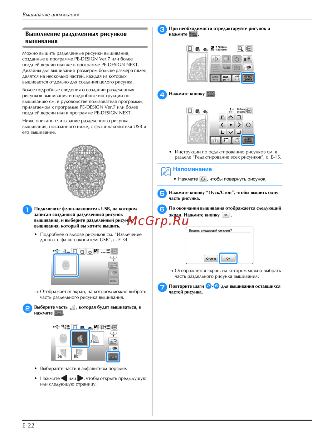 вышивания, показанного ниже, с флэш-накопителя USB и