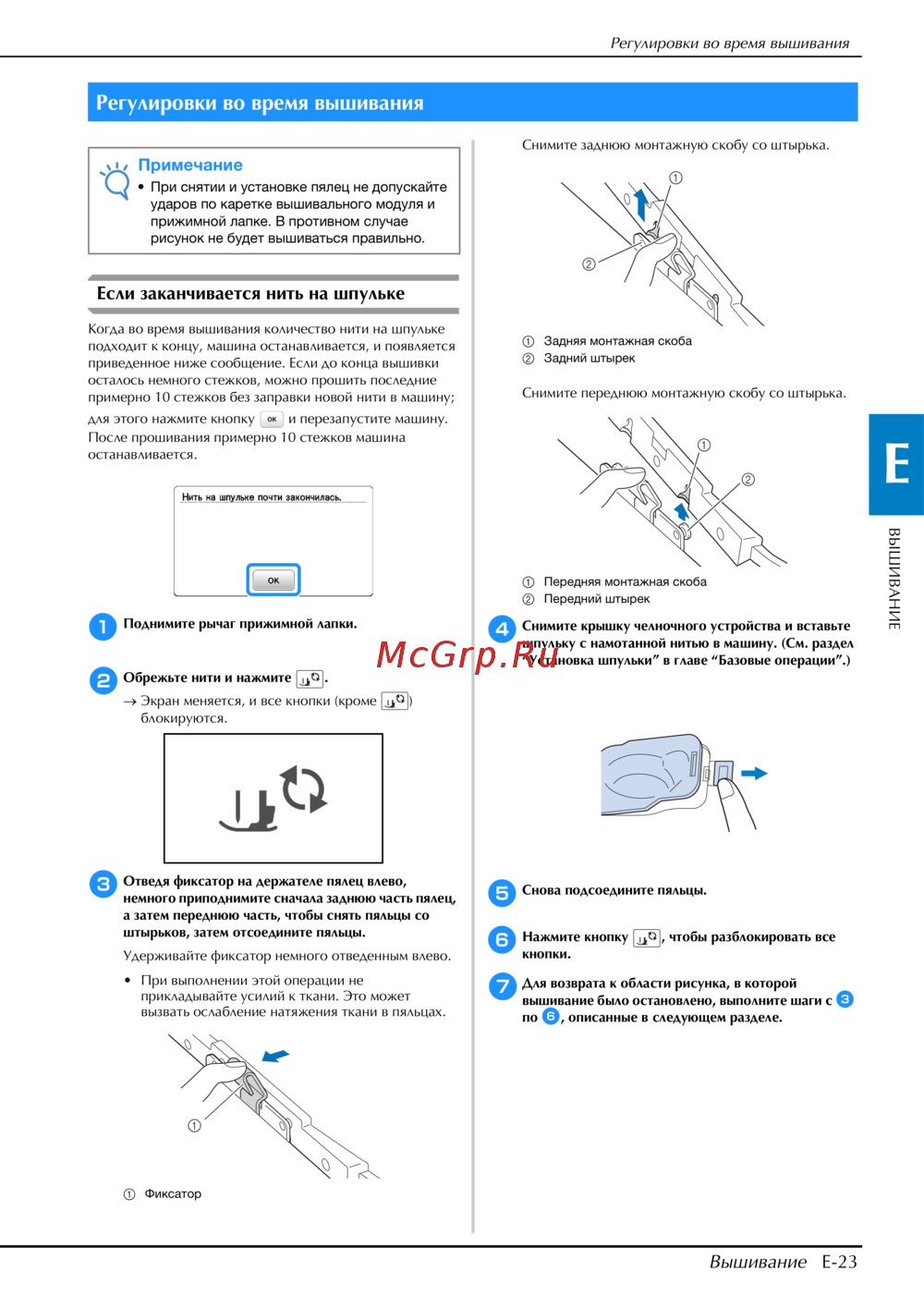 - Убедитесь в правильной установке шпульного колпачка в противном случае возможна поломка иглы p.88
