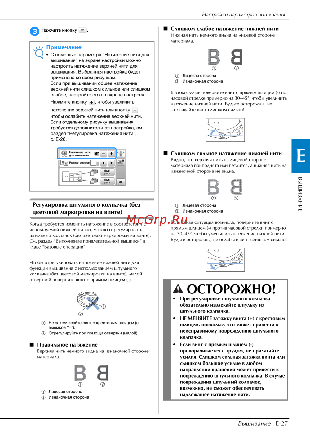 - Убедитесь в правильной установке шпульного колпачка в противном случае возможна поломка иглы p.88