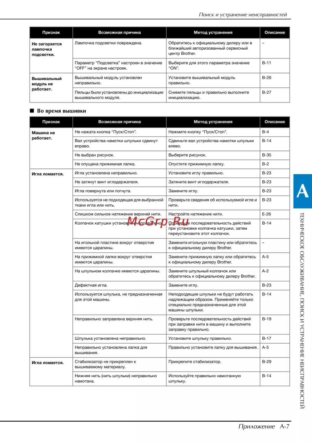 Brother INNOV-IS NV F440E (F 440 E) — поиск и устранение неисправностей в вышивальных машинах [91/100]