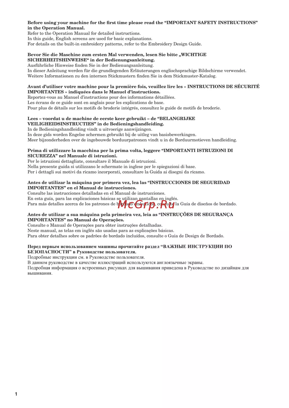- Перед первым использованием машины прочитайте раздел важные инструкции по безопасности в руководстве пользователя подробные инструкции см в pуководстве пользователя в данном руководстве в качестве иллюстраций используются англоязычные экраны подробная информация о встроенных рисунках для вышивания приведена в руководстве по дизайнам для вышивания p.2