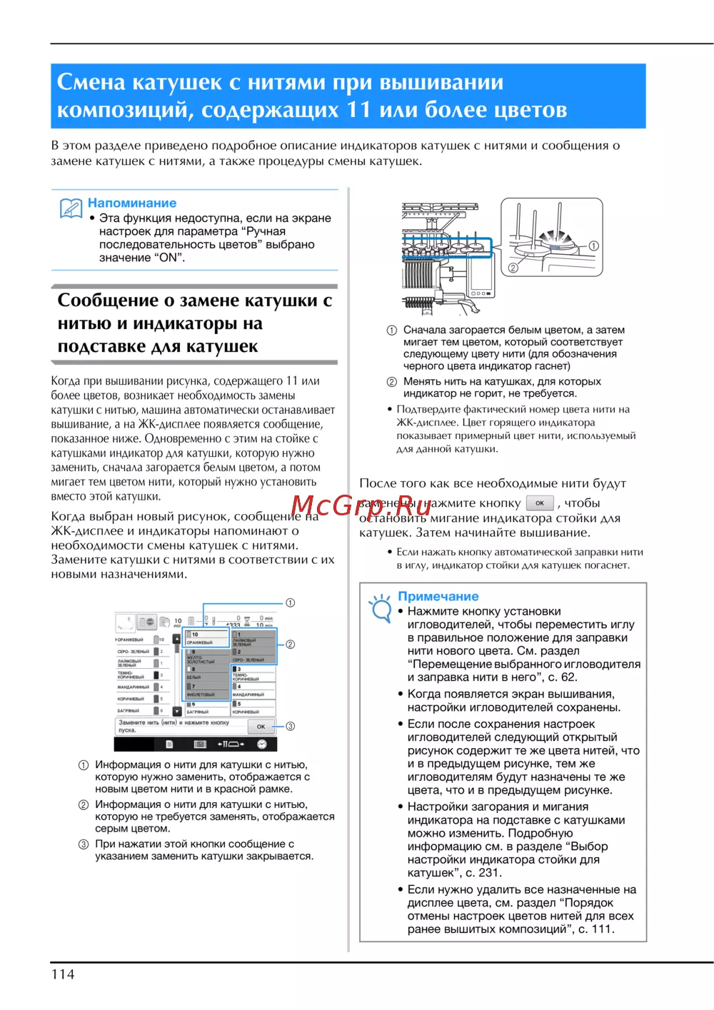 В этом разделе приведено подробное описание индикаторов катушек с нитями и сообщения о
