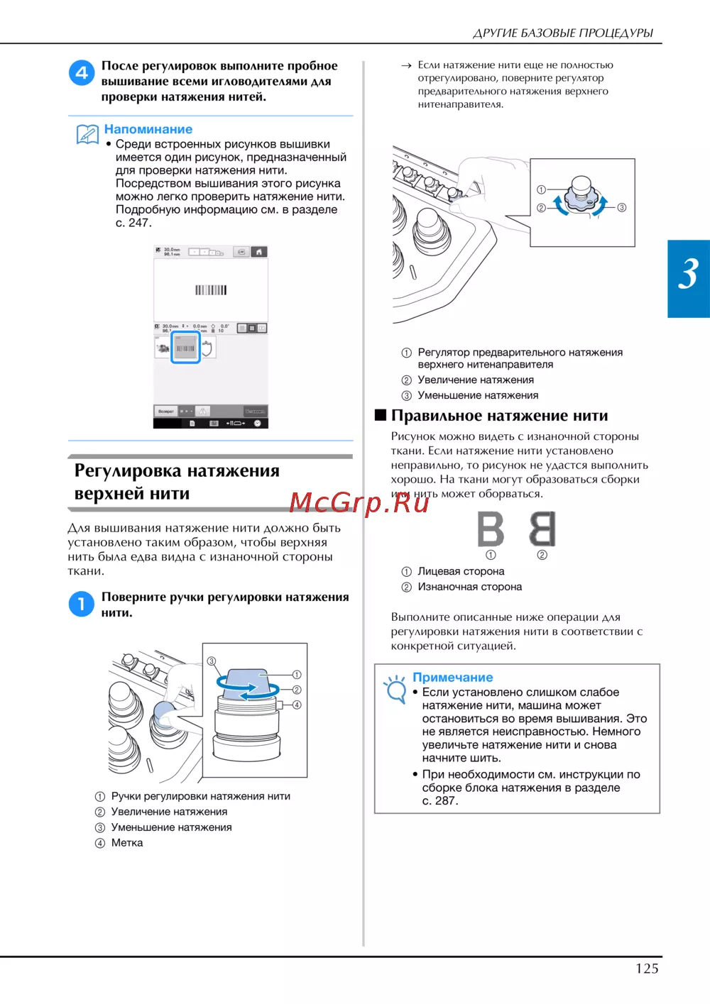 - Уменьшите натяжение верхней нити и убедитесь что при протягивании нити регулятор натяжения вращается p.294